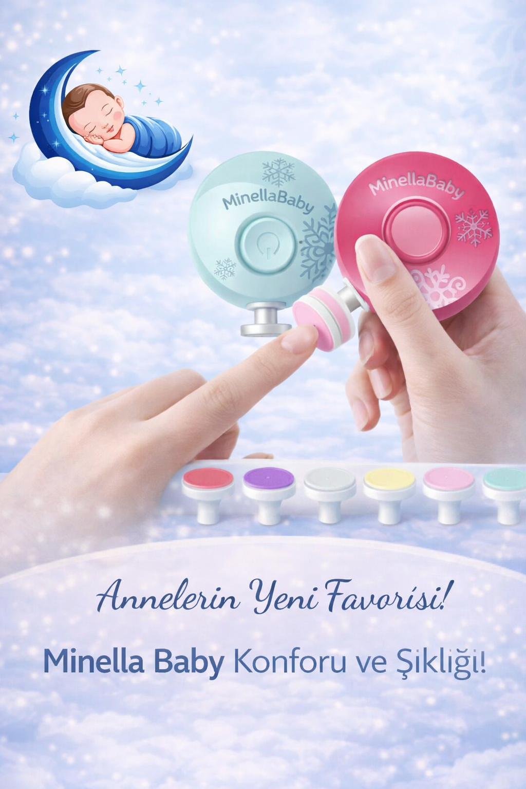 MinellaBaby elektrikli tırnak törpüsü, bebeğinizin hassas tırnaklarını kesmeden, nazikçe törpüleyerek güvenli bir bakım sunar. Sessiz çalışması sayesinde uyurken bile rahatlıkla kullanılabilir. Farklı başlık seçenekleri ile her yaşa uygun pratik ve konforlu bir çözüm.